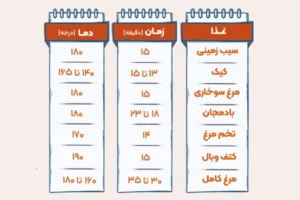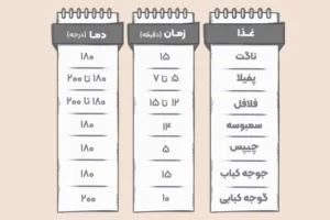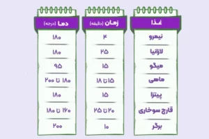 پخت یکنواخت و باکیفیت غذا: اگر زمان و دمای مناسب برای هر نوع غذا را رعایت نکنید، غذا ممکن است نیمپز، خشک یا بیش از حد برشته شود. جدول به شما کمک میکند که با خیال راحت، هر غذایی را درست و با بافت دلخواه آماده کنید.